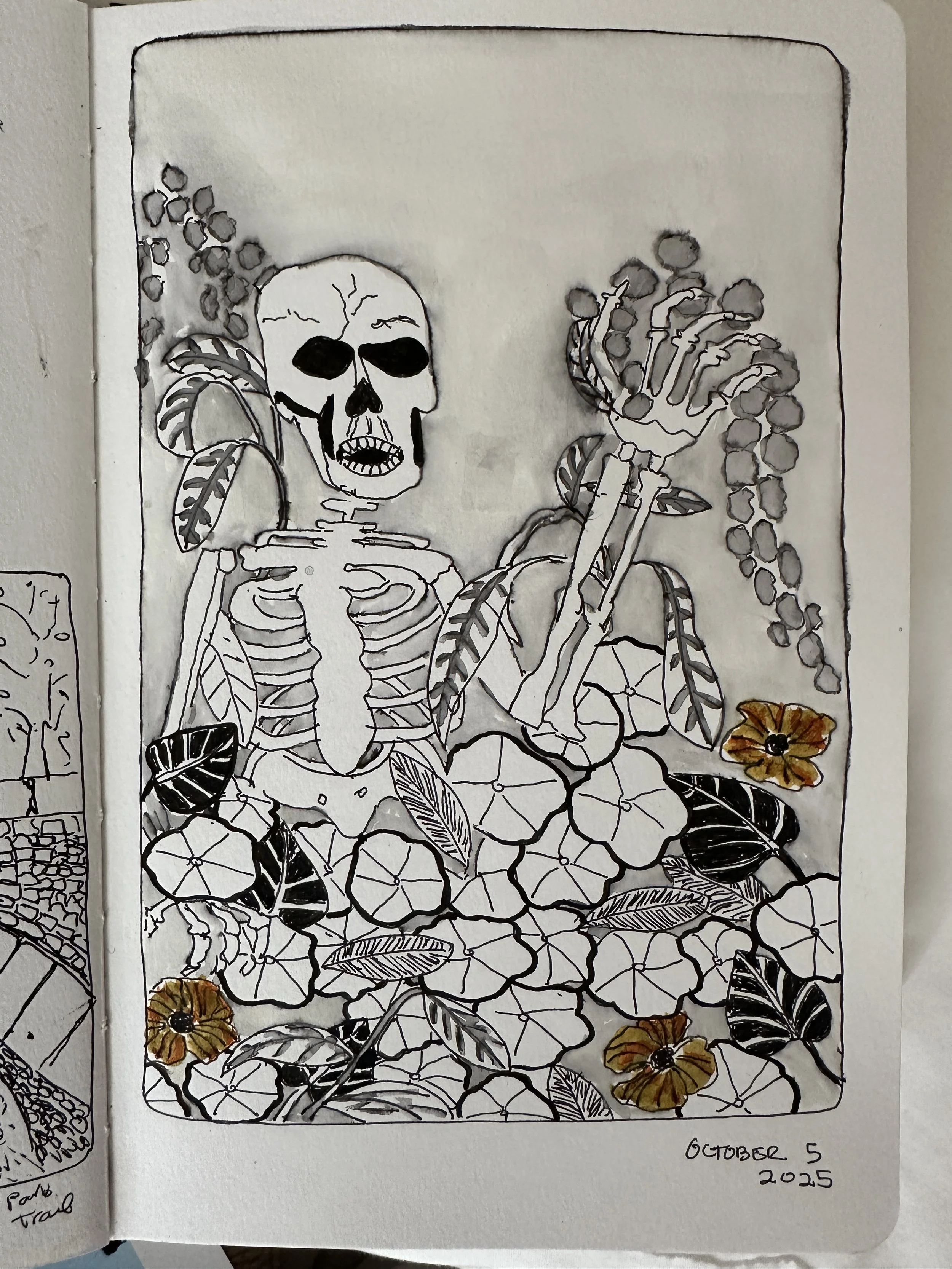 /I saw this most excellent skeleton placed just so in someone’s garden while traveling through Arcadia. A celebration of life, I think (which of course includes death). I had a little extra time this morning to play with value contrasts so that was fun.