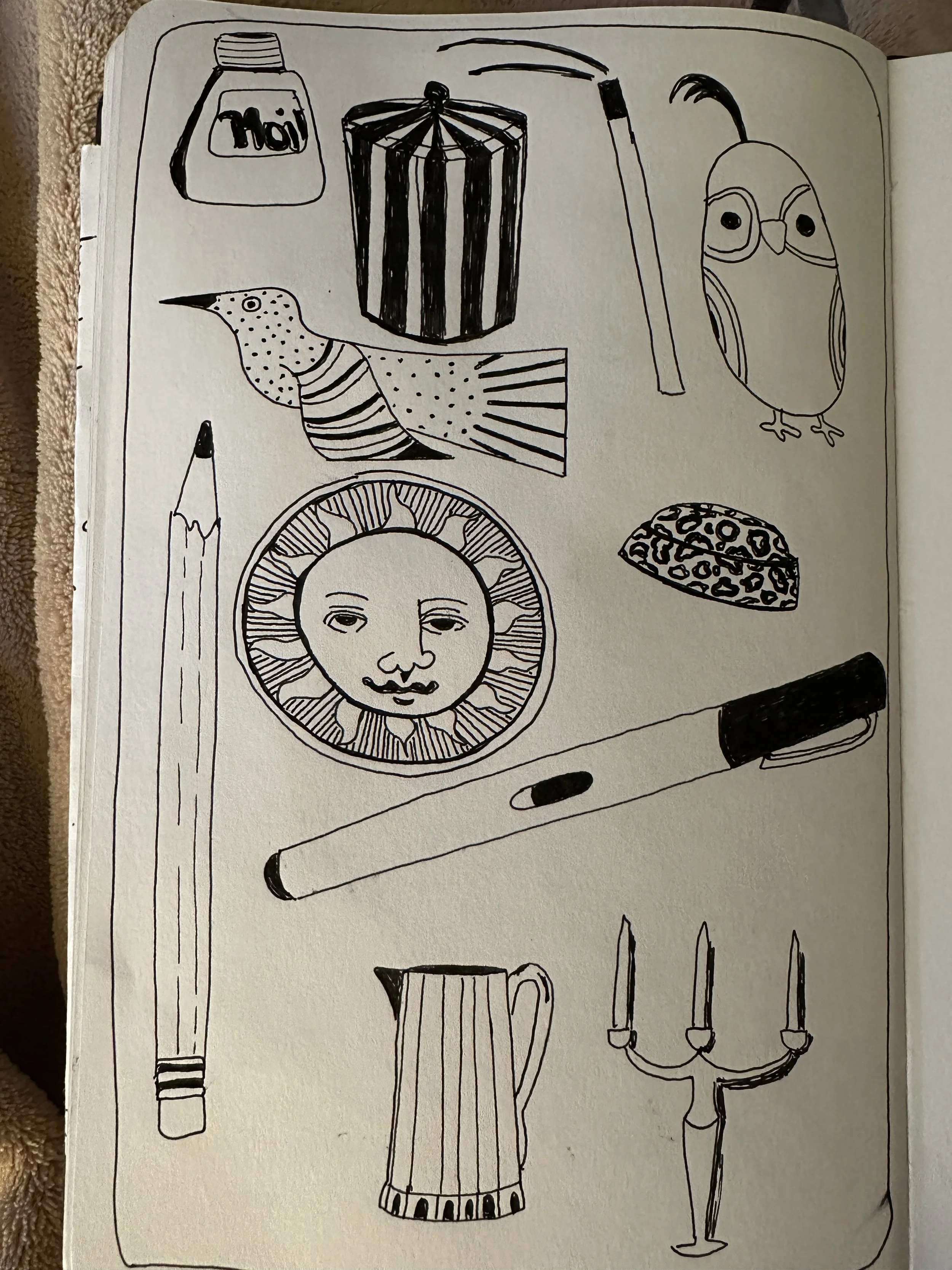 A couple writing utensils, a few items from a lovely Substack post (https://alilabelle.substack.com/p/you-too-can-live-in-the-world-of)that curated actual things in the world inspired by the Madeline children’s book drawings. And then a few whimsical from-my-imagination sketches (surely influenced by bits I’ve probably stored away in my brain from other artists). It was a peaceful time of drawing while watching the final episodes of Traitors New Zealand on my iPad in my motel room.