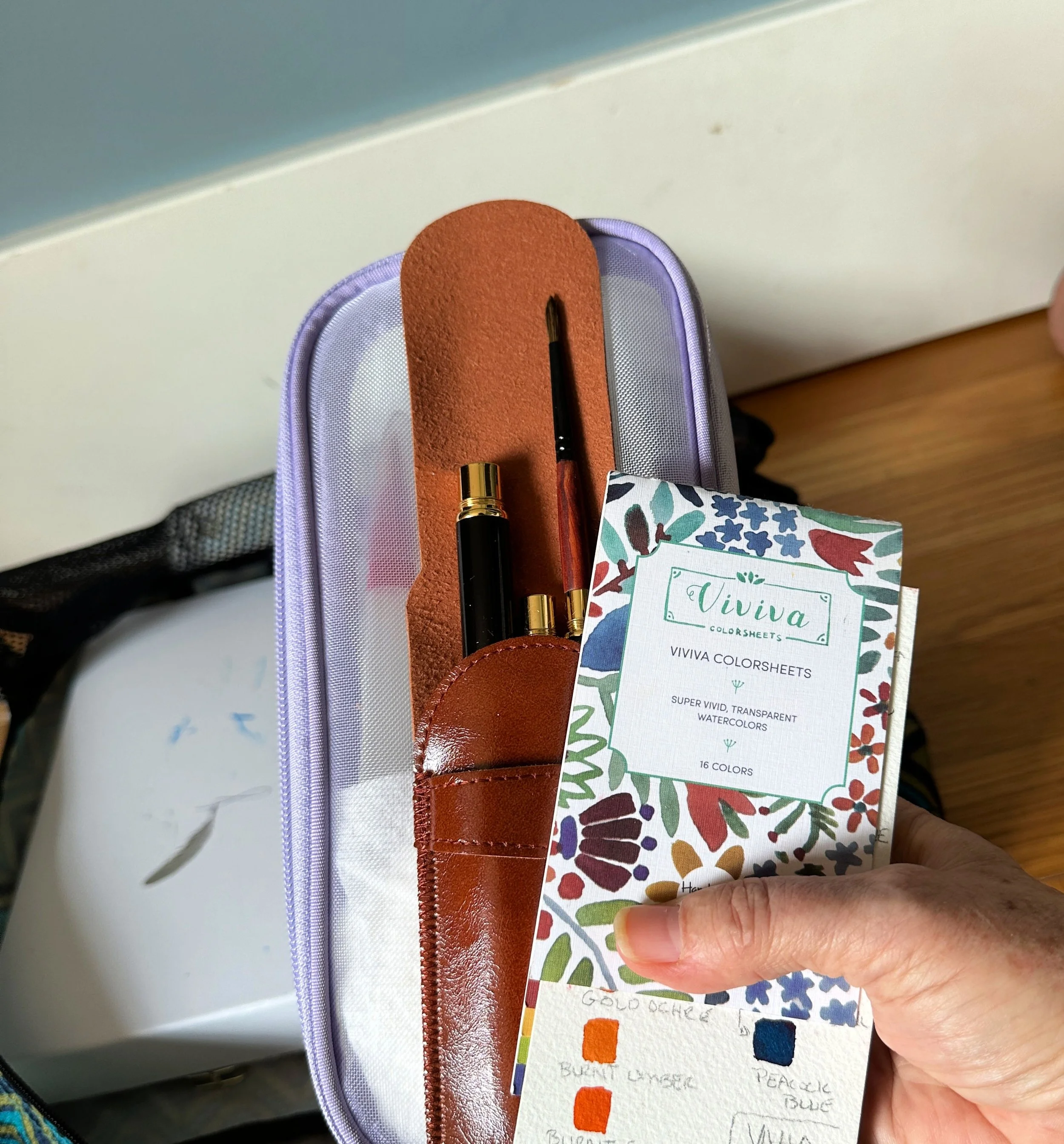 I also carry a very small “wet media bag”. This is for travel watercolors (color sheets and/or a small tin of colors), travel paintbrushes, and a paper towel.
