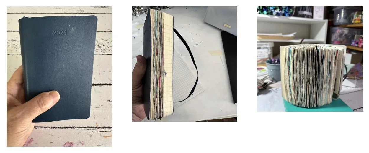 Well, for this project I set out to fill a small 3”x5” Moleskine diary —365 dated pages made of crappy paper—with some kind of art every day. For a year.